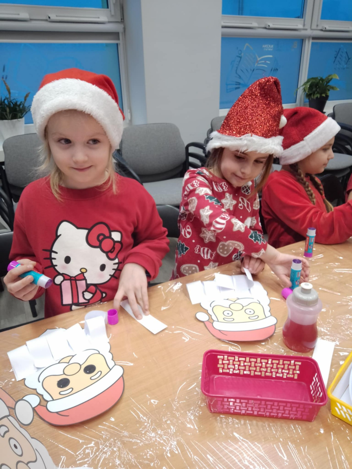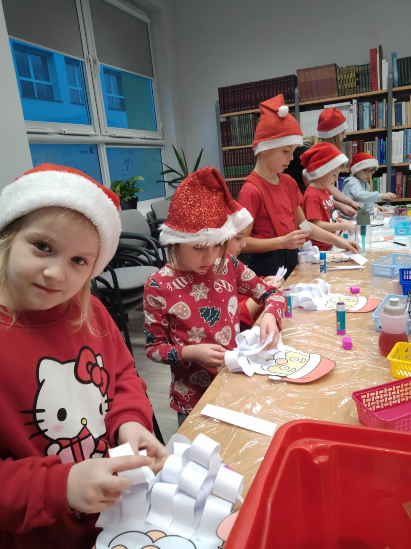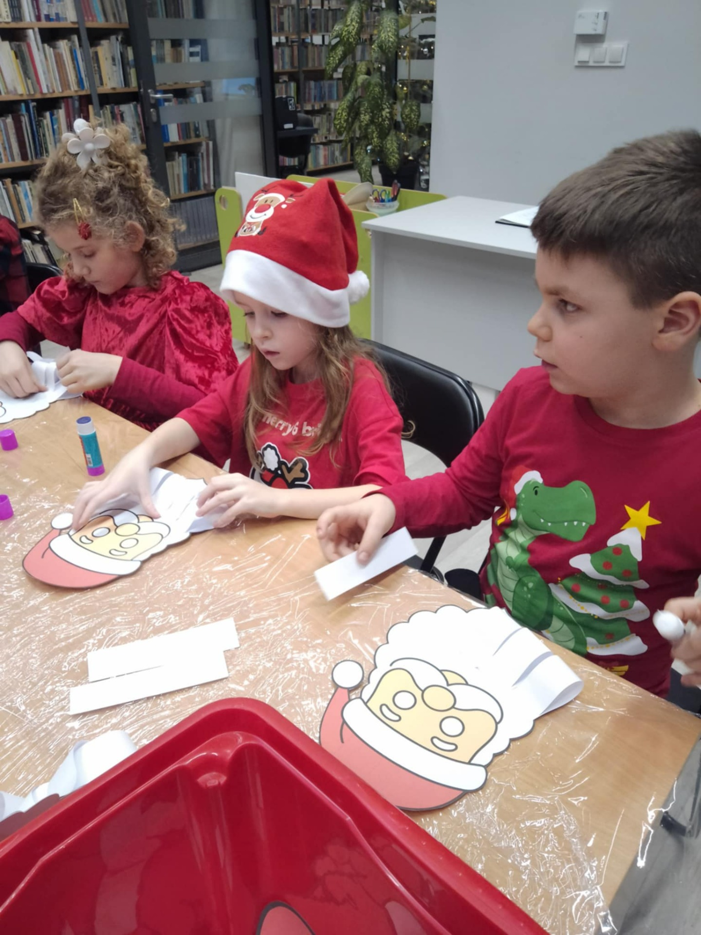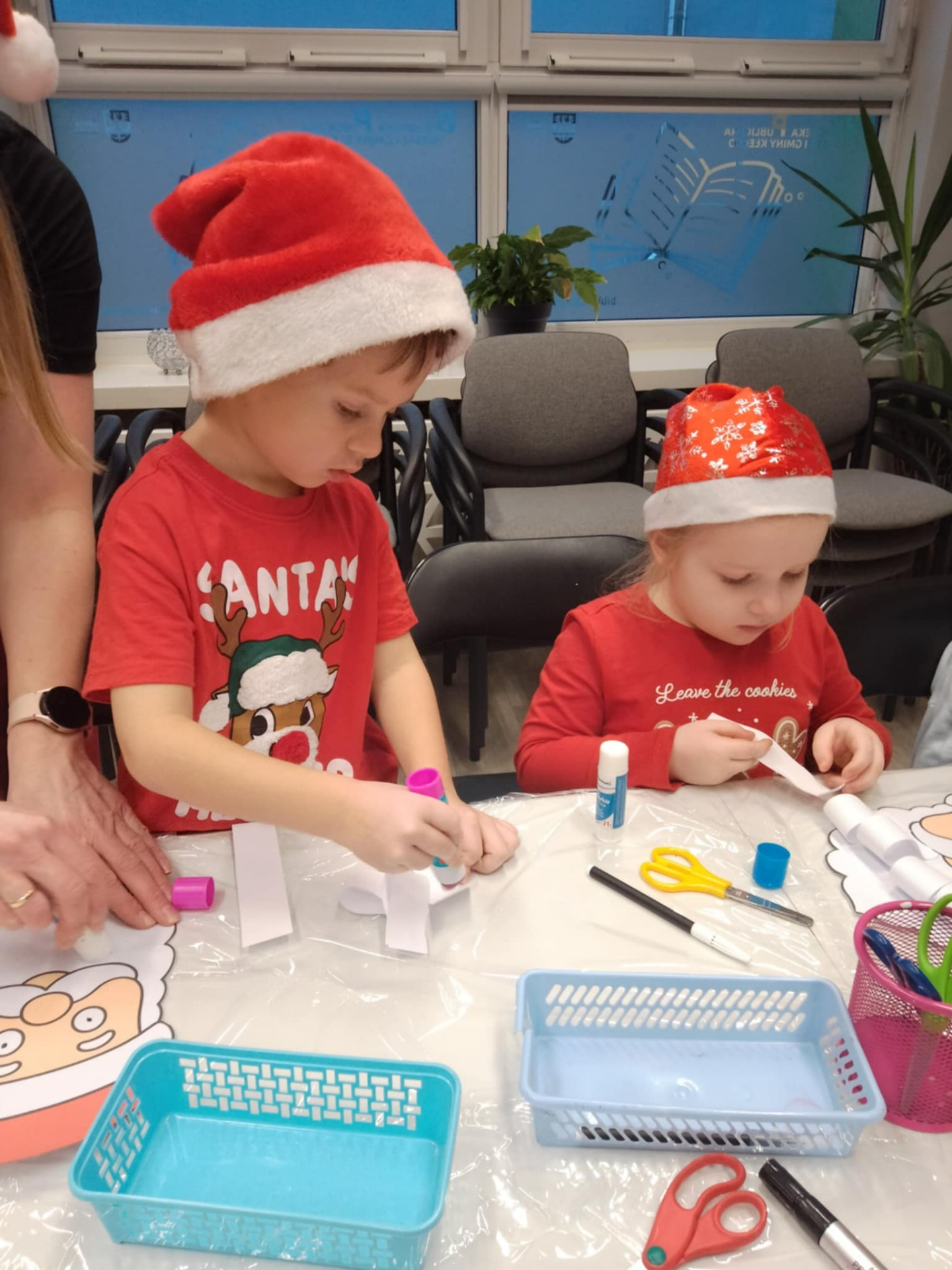Podczas zajęć dzieci wykonały pracę plastyczną „Ruchomy Mikołaj”, rozwijając swoją kreatywność oraz zdolności manualne. Następnie uczestnicy wysłuchali bibliotecznej opowieści „Śladami Mikołaja”, która stała się punktem wyjścia do rozmów oraz dalszych aktywności.