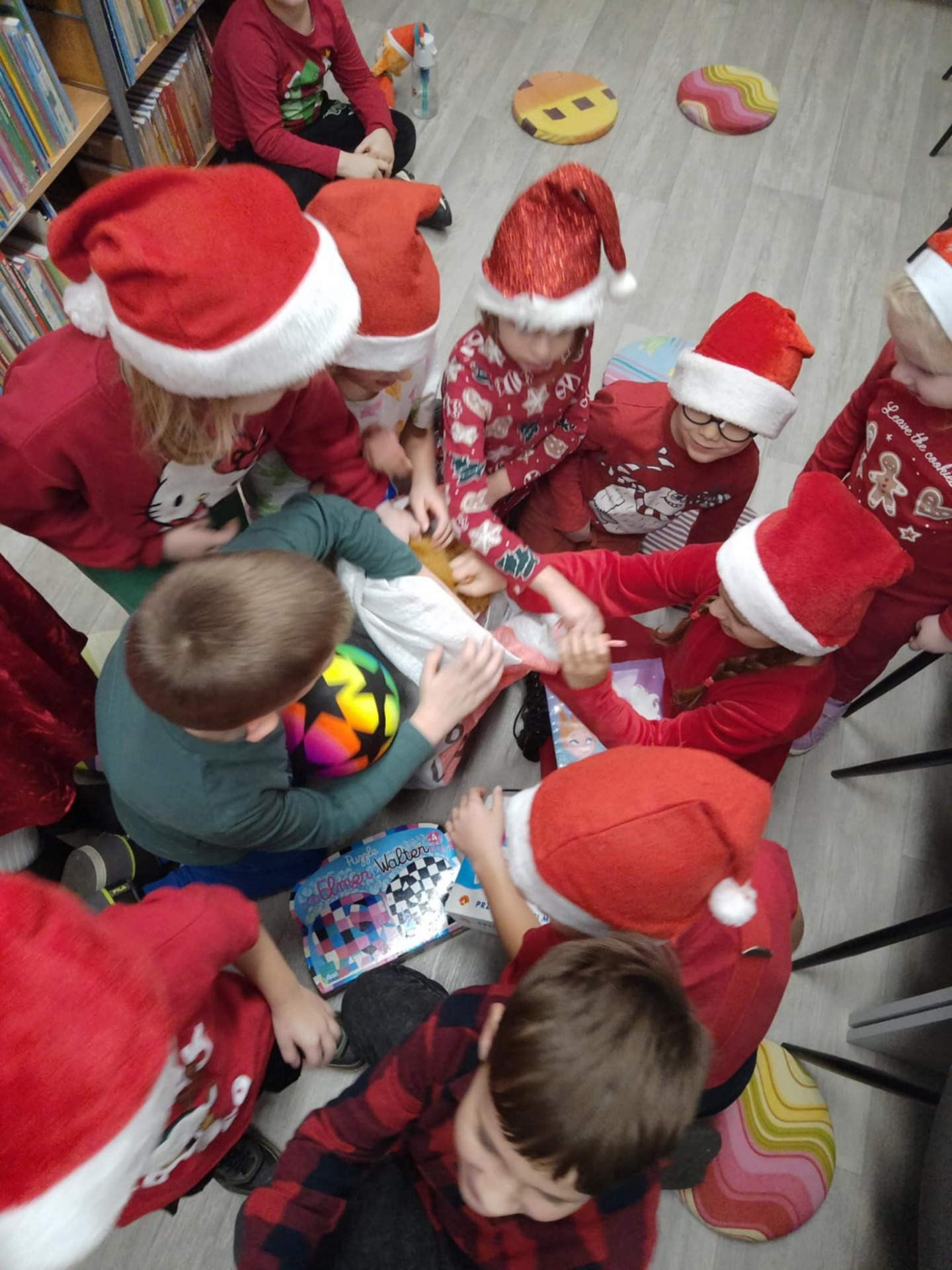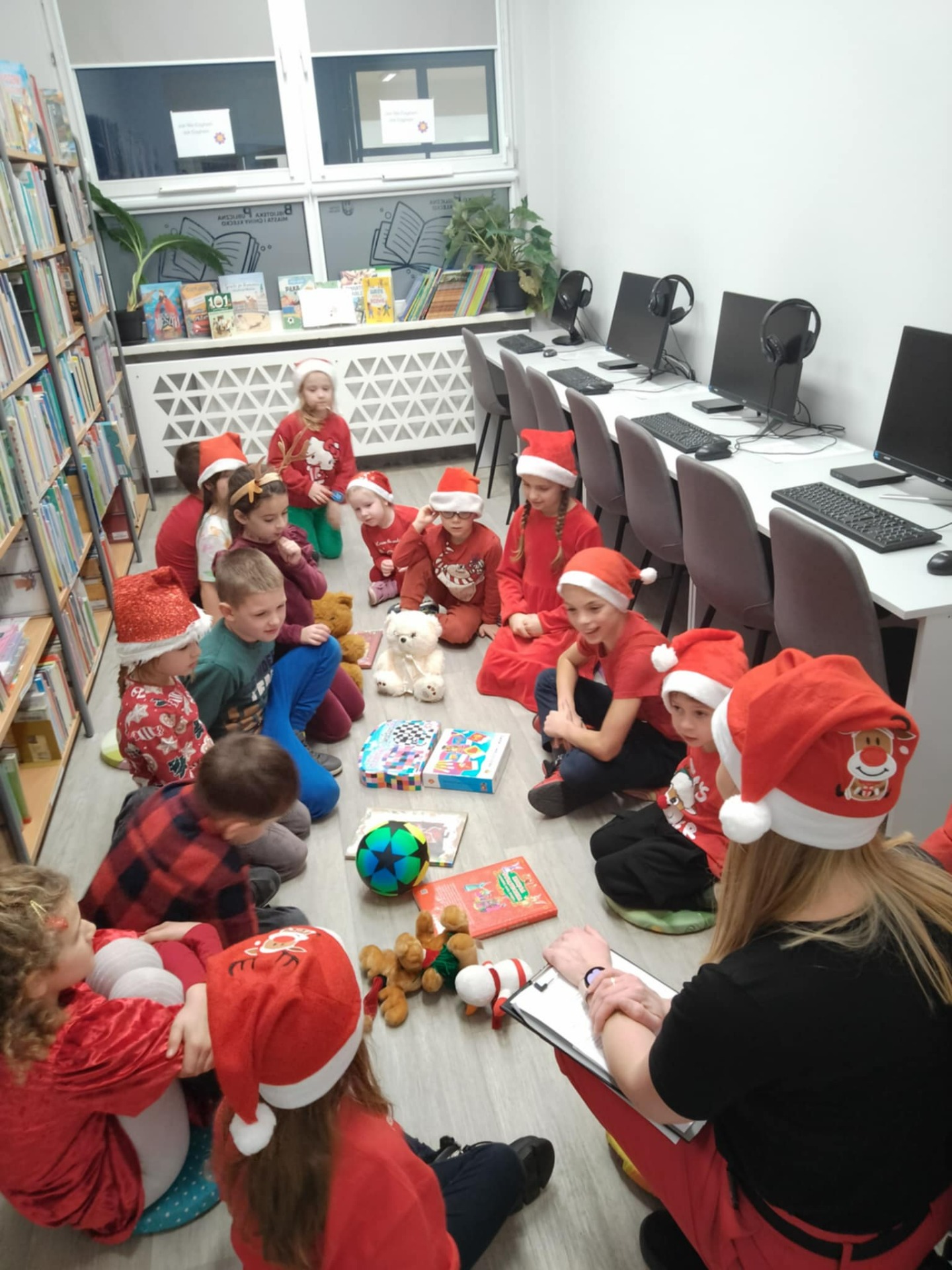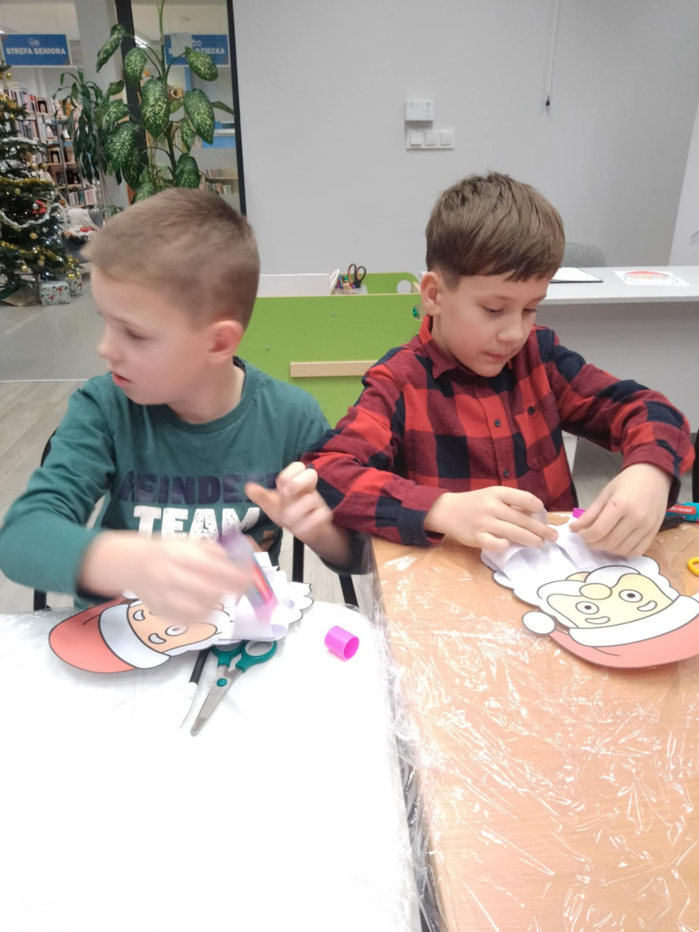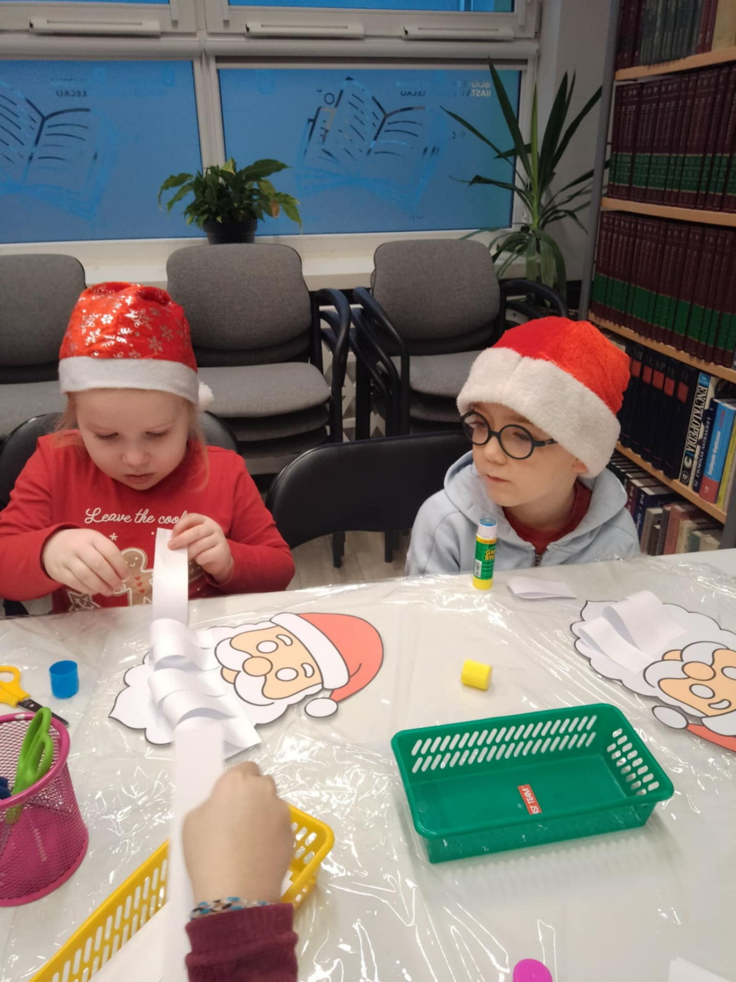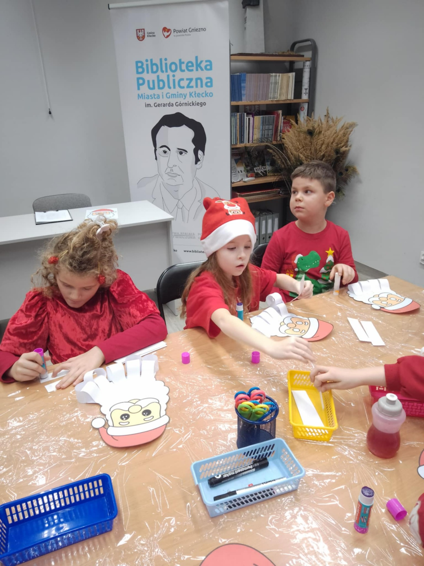 Podczas zajęć dzieci wykonały pracę plastyczną „Ruchomy Mikołaj”, rozwijając swoją kreatywność oraz zdolności manualne. Następnie uczestnicy wysłuchali bibliotecznej opowieści „Śladami Mikołaja”, która stała się punktem wyjścia do rozmów oraz dalszych aktywności.