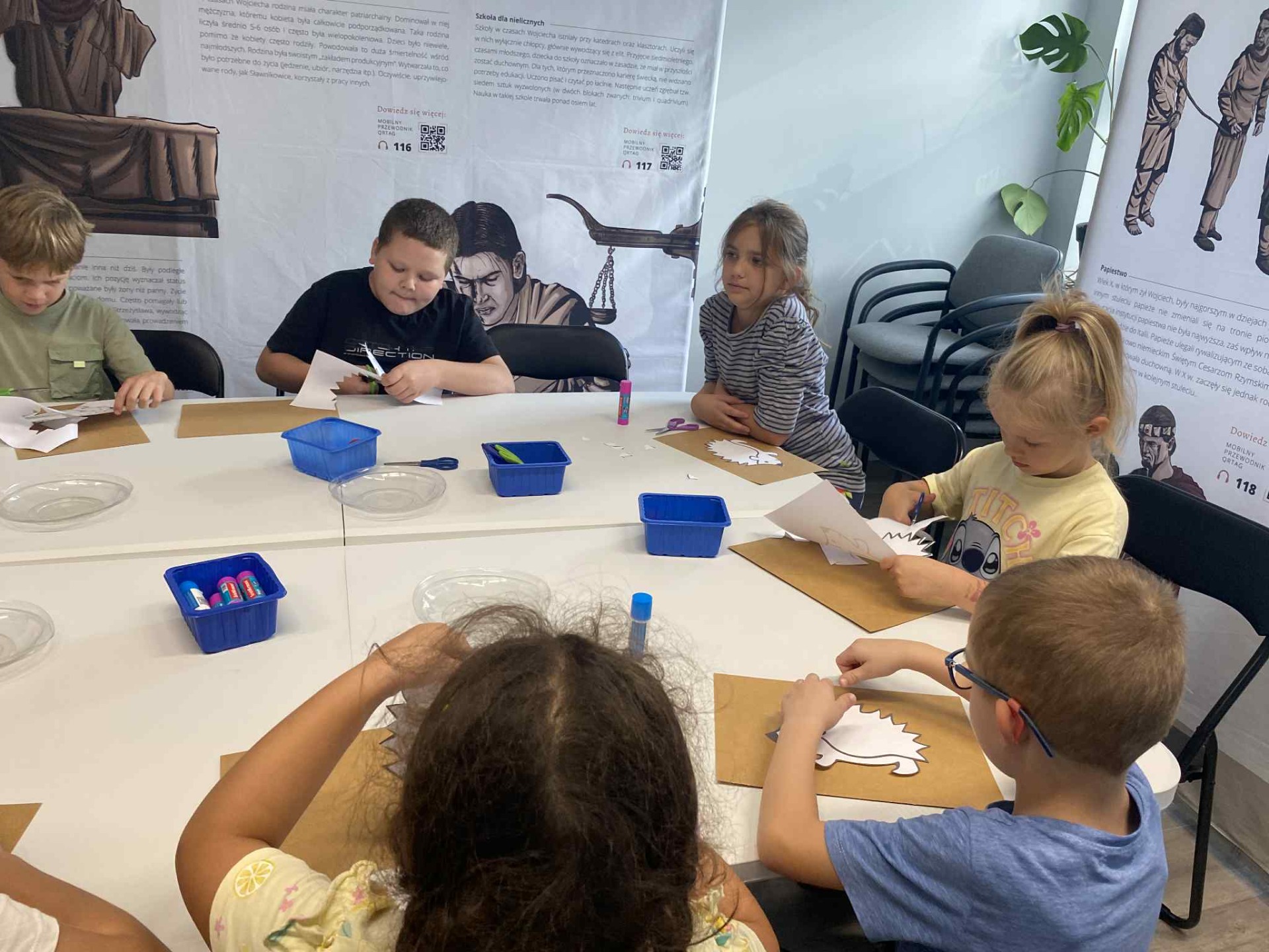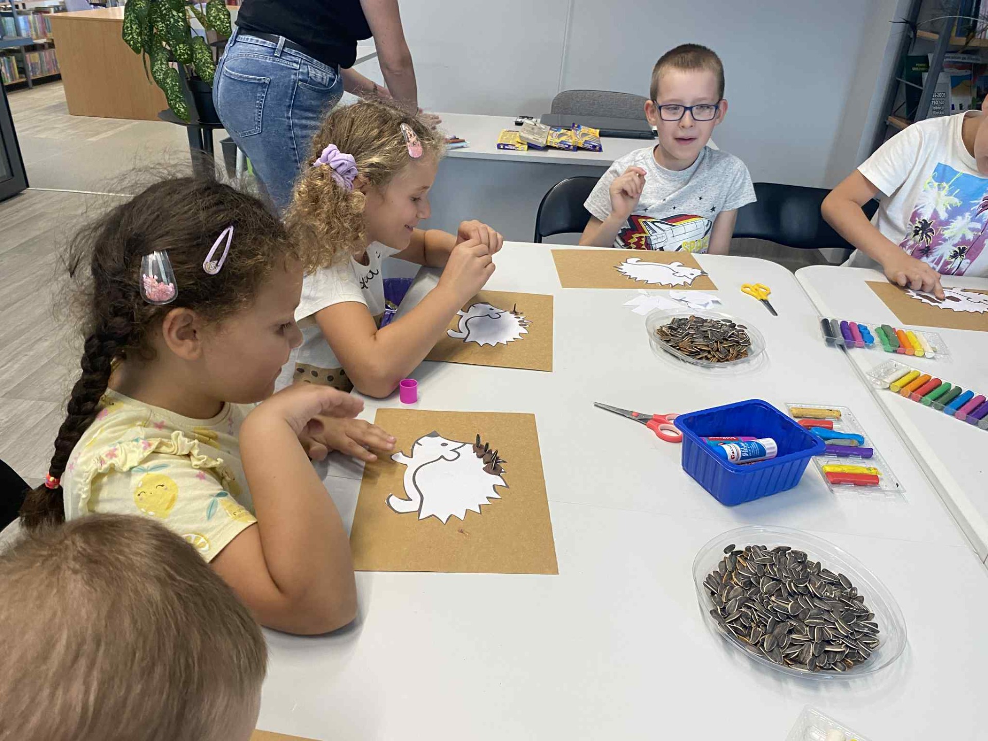 Spotkanie rozpoczęło się wspólnym czytaniem opowieści pt. "Wielka przygoda jeżyka", która wprowadziła dzieci w klimat jesieni🦔 Następnie uczestnicy wykonali kolorowe jeżyki, dzięki którym biblioteka zamieniła się w jesienny leśny zakątek🦔🍂